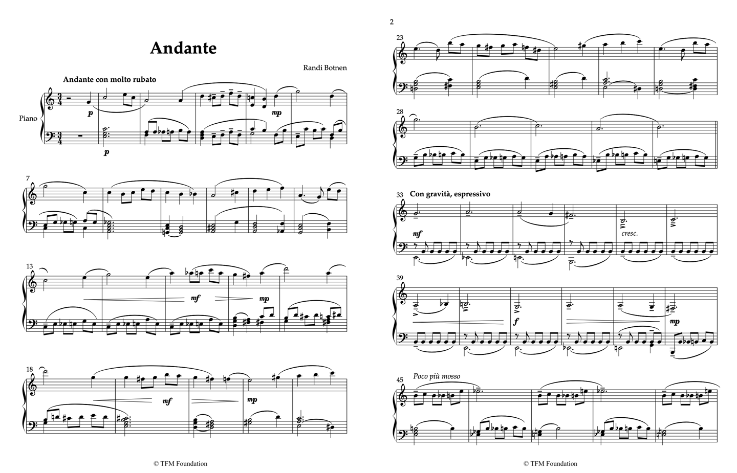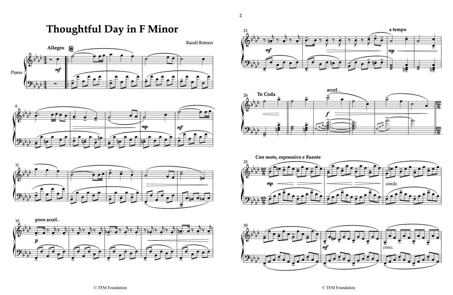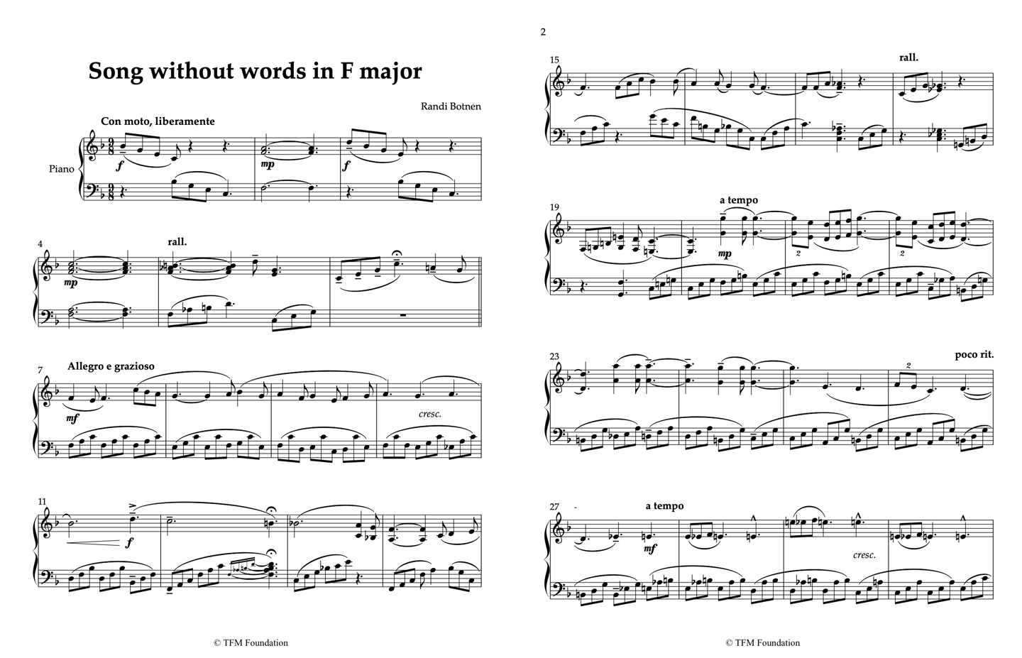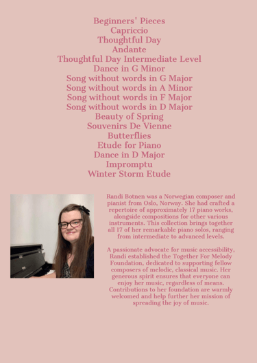 A lifelong dream of Randi’s was to bring all her piano works together in a single volume, with Auguste Renoir’s Two Young Girls as the cover. This collection, Complete Piano Works, features all 17 of her piano compositions, ranging from intermediate to advanced levels, offering pianists the opportunity to explore her distinct musical voice. She approved the final version of her book before passing peacefully in her sleep, free from pain after a long battle with cancer. In a final act of generosity, she made the sheet music freely available to the public, ensuring her music would be shared for generations to come. Hopefully, through learning some of Randi’s pieces, you can get to know her through the notes she left behind.