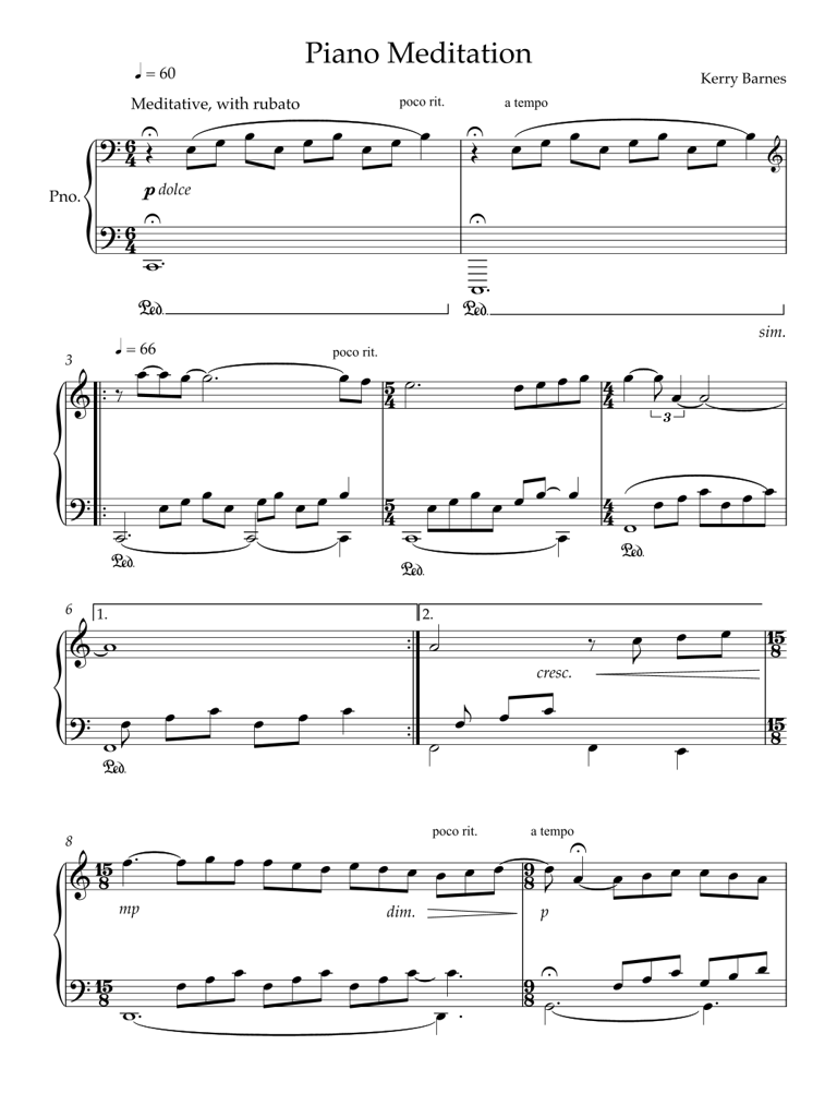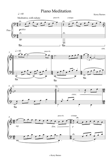 Former concert pianist and piano teacher Kerry Barnes is a prolific composer with nearly 200 works to her name, spanning the Neo-Classical and New Age genres. A cherished friend and long-term client, she writes for piano, choirs, ballet schools, and orchestras, with her sheet music available through SMP Press, Sheet Music Direct, and Pitch Perfect Music Services.